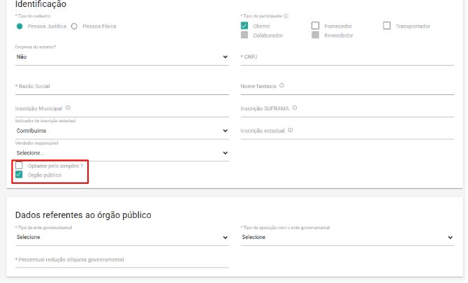 Ao cadastrar um cliente Pessoa Jurídica, o sistema exibe a opção “Órgão público”. Ao marcar essa opção, o sistema exibirá uma nova sessão chamada “Dados referentes ao órgão público”.