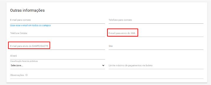 Para enviar o XML e PDF da nota automaticamente para o seu cliente, cadastre o e-mail dele nos campos E-mail para envio do XML e para envio DANFE.