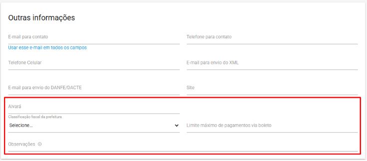 Os campos Alvará, Classificação fiscal da prefeitura, E-mail para contato, Site e Observações são opcionais.